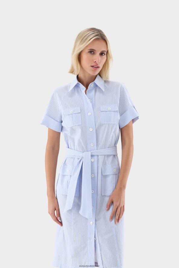 The knee-length fitted shirt dress features short raglan sleeves, patch pockets, a fixed belt and is made from BCI cotton in a seersucker stripe pattern. Combining comfort and style with its fitted fit, this dress is a versatile and chic addition to Your wardrobe.