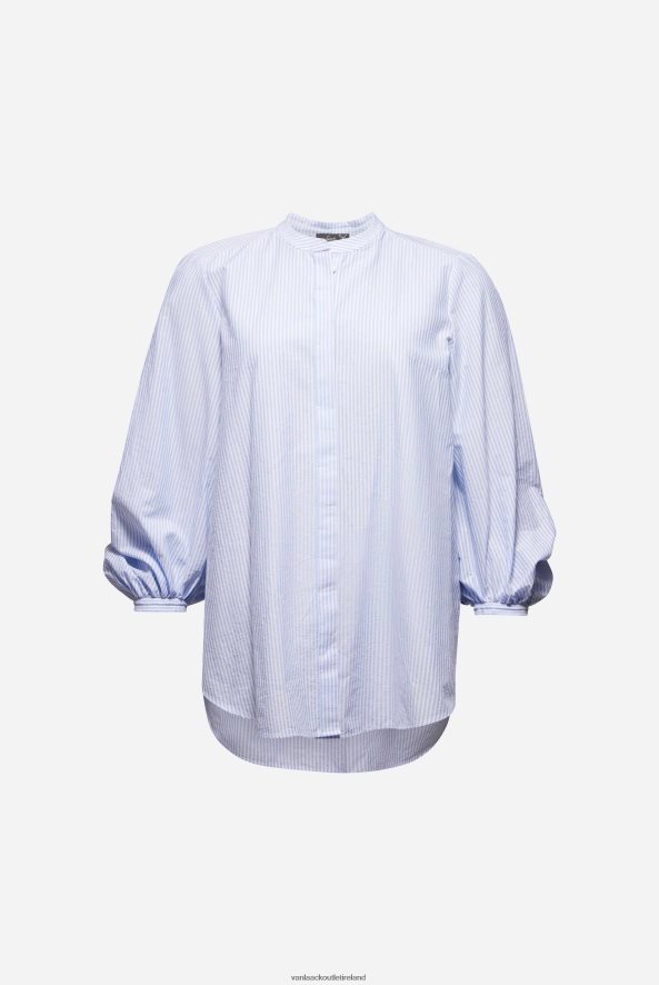 The loose-fitting blouse with long balloon sleeves, stand-up collar, concealed placket, and gathered back is made from a cotton structured stripe with Jacquard stripes. Jacquard is a fabric with an woven pattern, in this case, featuring stripes for a structured look.