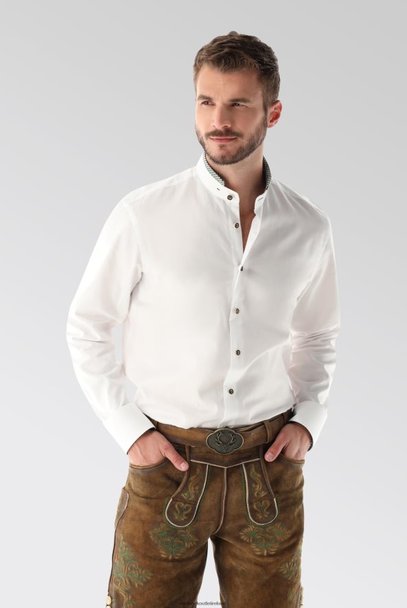 The white shirt with checked piping details on the inner side of the stand-up collar, is the luxurious choice for your outfit. Made of high-quality and soft oxford fabric, it is one of the finest oktoberfest shirts on the market. The traditional stand-up collar and real horn buttons complete the traditional yet noble look. Combined with lederhosen, a jacket and a traditional waistcoat, this shirt really stands out.
