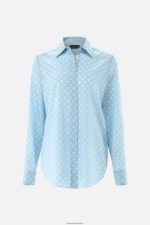 The loose-fit shirt blouse with long sleeves and a back yoke with a box pleat is made from silk crepe de chine stretch featuring a dot print. It has a relaxed cut, concealed placket, back yoke with box pleat, Kent collar, and mother-of-pearl buttons.